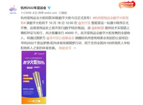 杭州亚残运会火炬同款3D数字火炬发布 蚂蚁链提供技术实现链上确权存证与发行快报