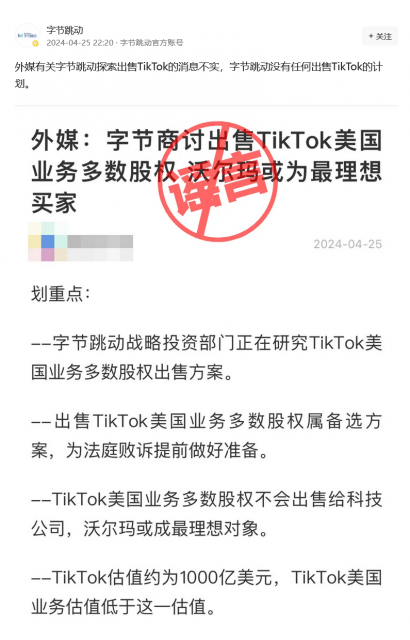 外媒有关字节跳动探索出售TikTok的消息不实,字节跳动内部已开始探索出售TikTok美国业务多数股权的方案,对于外媒所报道的相关消息。