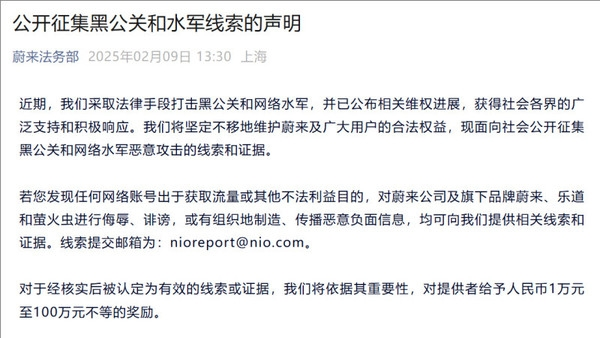 今年以来,蔚来法务部一直在“努力营业”,积极采取各种措施来应对黑公关和网络水军的恶意攻击。2月9日,蔚来法务部发布声明,面向社会公开征集针对蔚来及其旗下品牌的黑公关和网络水军恶意攻击的线索和证据,并承诺对提供有效线索者给予最高100万元的奖励。