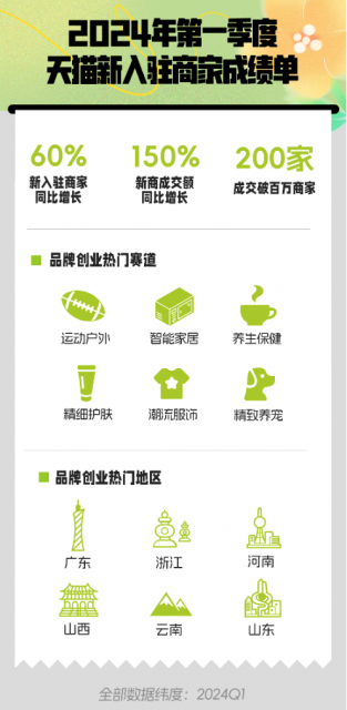 【TechWeb】4月16日消息,今日,天猫公布2024年第一季开店数据:新入驻商家同比增长60%,全球大牌、新锐品牌加速入驻天猫。其中,运动户外、智能家居、养生保健、精致养宠、潮流服饰、精细护肤等成为今年热门赛道,新商数量同比增长100%。