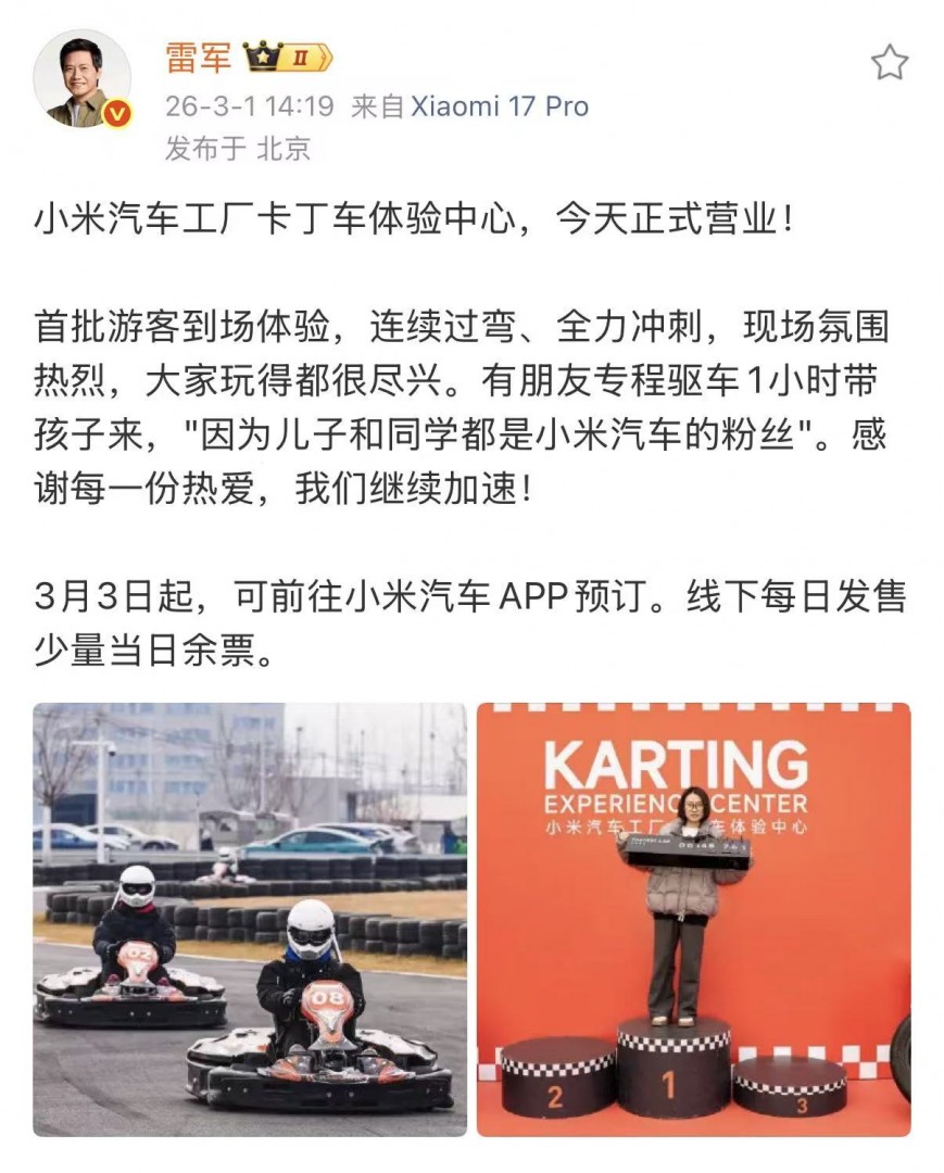 雷军:小米汽车工厂卡丁车体验中心今天正式营业汽车