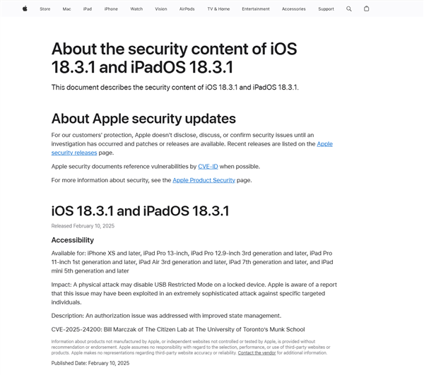 苹果官网显示,iOS 18.3.1更新修复了一个与辅助功能相关的漏洞,该漏洞可能允许黑客在设备锁定状态下禁用USB限制模式,苹果已确认该漏洞在一些针对特定用户的高级攻击中被利用。