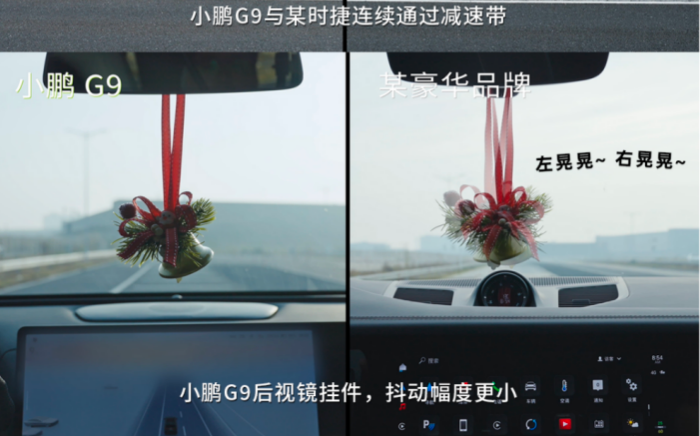 而在过减速带的柔和感的测试中,两台车通过减速带的过程中,小鹏G9上的挂件摇晃程度更低,稳定性更强,再次优于保时捷。