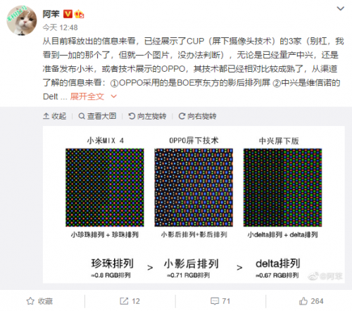 根据他的分析,OPPO采用的是BOE京东方的影后排列屏(注:也被网友称之为小黄鸭排列),中兴是维信诺的Delta排列屏 ,小米是华星光电的钻石排列屏。