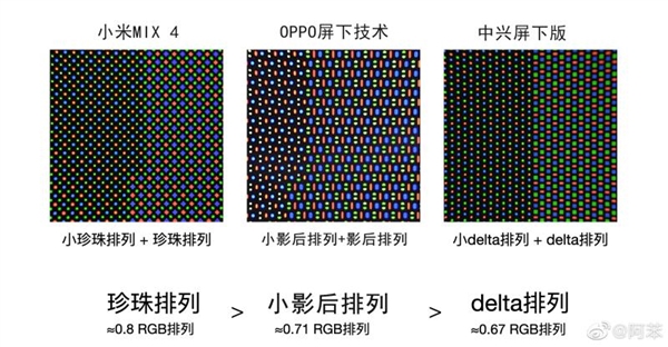 这三种像素排列的显示效果是不同的,小米MIX4的方案是小珍珠排列+珍珠排列,等效于0.8 RGB排列,OPPO的屏下技术是小影后+影后排列,等效于0.71 RGB排列,中兴的屏下方案是小Delta排列+Delta排列,等效于0.67 RGB排列。