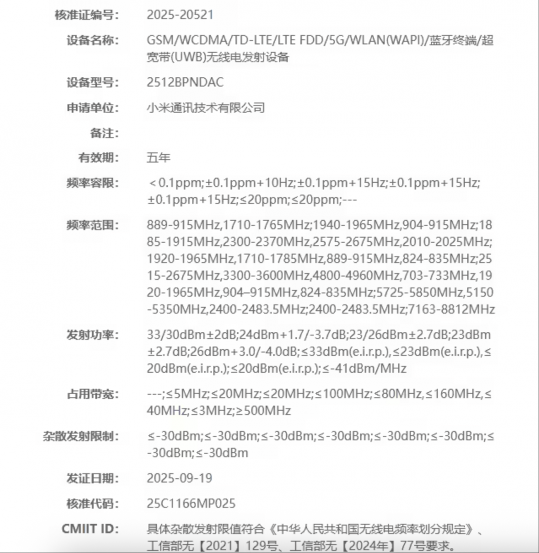 巧的是,小米昨天正好有一款神秘新旗舰通过了工信部无线电核准认证,型号为 2512BPNDAC,也就是之前曝光的小米 17 Ultra。认证信息显示,这款新机将支持 UWB 技术,但不支持卫星通信。