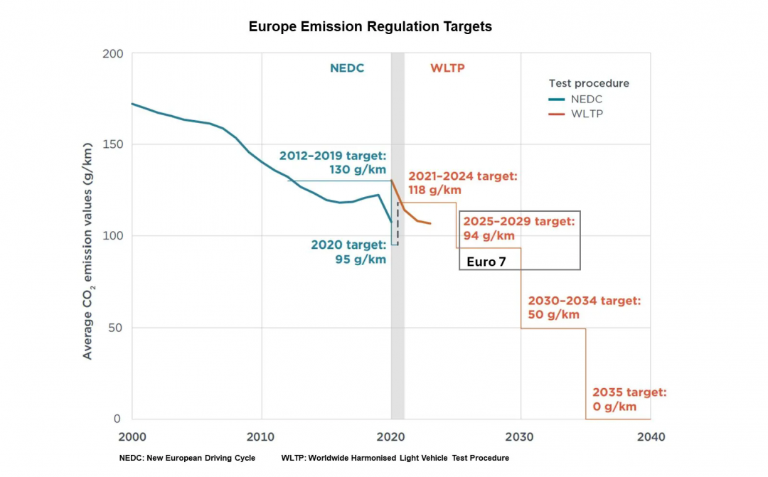 报告称欧洲车企面临的新挑战,是 2025 年 7 月生效的欧 7(Euro 7)排放标准,其中要求新车每公里的平均二氧化碳排放量应从目前的 116 克降至 93 克。