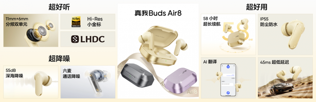 同步亮相的真我Buds Air8,配备11mm+6mm分频双单元,支持LHDC 5.0与Hi-Res认证,拥有55dB深海降噪与5000Hz降噪频宽。它还是AI随身翻译官,支持30种语言实时互译,并支持行业首批三设备连接,售价299元。