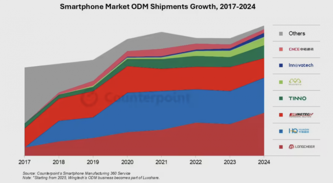 Counterpoint Research 的最新《全球智能手机 ODM 产业报告》显示,部分头部 ODM 厂商已开始将业务拓展至中国以外,手机品牌厂商愈发依赖 ODM 模式来实现规模效益。