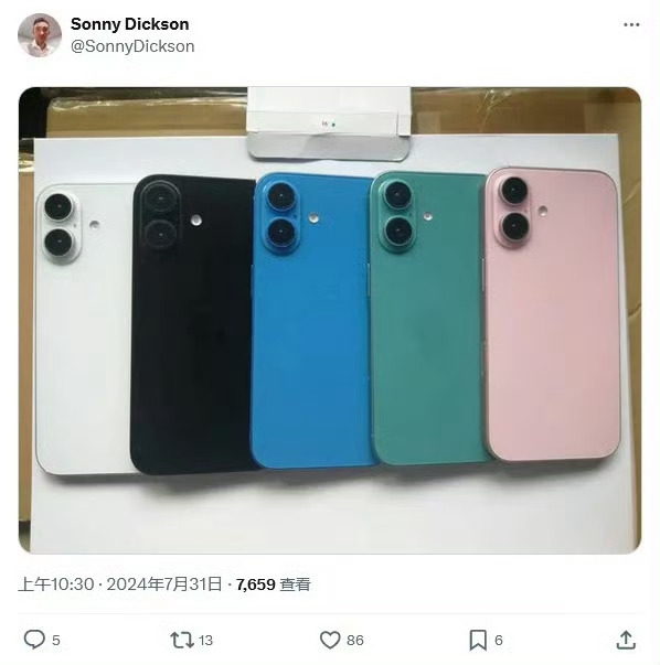 据海外知名爆料达人最新晒出的机模谍照,全新的iPhone 16标准版这次将提供五款配色,分别是白色、黑色、蓝色、绿色和粉色。