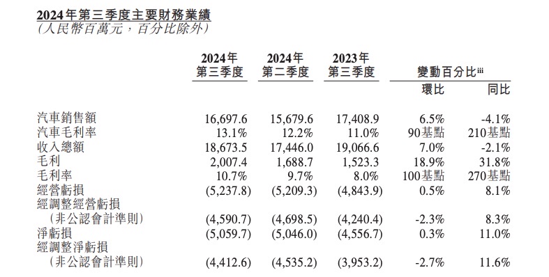 11月20日,蔚来汽车发布了2024年第三季度财报。财报显示,蔚来三季度营收186.7亿元,同比减少2.1%,环比增长7%,汽车方面的营收为166.98亿元,同比下降4.1%。