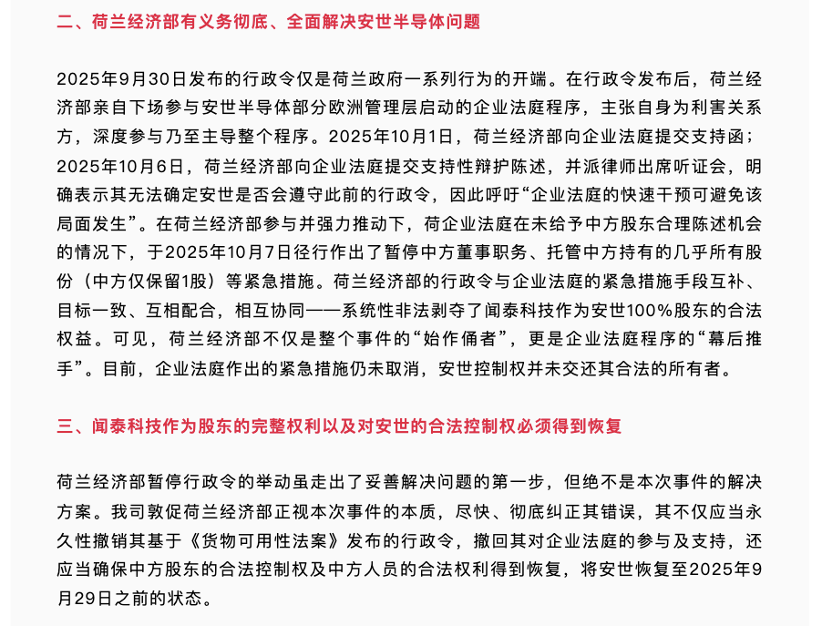 闻泰科技股份有限公司(以下简称“闻泰科技”或“我司”)注意到荷兰经济事务与气候政策部(以下简称“荷兰经济部”)大臣2025年11月19日发表的“暂停实施其于2025年9月30日依据《货物可用性法案》对安世下达的行政令”的声明。作为安世半导体的唯一控股股东,闻泰科技对此高度重视,现就相关事宜作出如下回应: 一、我司对荷兰经济部决定的立场我司注意到荷兰经济大臣的上述声明是在中国商务部与荷兰经济部磋商后发表的,我司衷心感谢中国商务部为解决安世半导体问题以及本次中荷磋商付出的巨大努力。荷兰经济大臣关于暂停行政令的表态,一定程度上体现了其正视当前问题的态度,我司认为这是向妥善解决问题方向迈出的第一步。荷兰经济部暂停实施行政令本身也说明了其此前行为的非法性和不当性。需要澄清和声明的是,行政令虽被宣布暂停,但荷兰阿姆斯特丹上诉法院企业法庭(以下简称“企业法庭”)作出的紧急措施并未取消,中方股东和人员合法权益所受到的限制和侵害仍在持续进行中。荷兰经济部仅宣布暂停行政令,回避了在其推动下的企业法庭剥夺闻泰科技对安世控制权的错误裁决,未能触及问题解决的关键所在。二、荷兰经济部有义务彻底、全面解决安世半导体问题2025年9月30日发布的行政令仅是荷兰政府一系列行为的开端。在行政令发布后,荷兰经济部亲自下场参与安世半导体部分欧洲管理层启动的企业法庭程序,主张自身为利害关系方,深度参与乃至主导整个程序。2025年10月1日,荷兰经济部向企业法庭提交支持函;2025年10月6日,荷兰经济部向企业法庭提交支持性辩护陈述,并派律师出席听证会,明确表示其无法确定安世是否会遵守此前的行政令,因此呼吁“企业法庭的快速干预可避免该局面发生”。在荷兰经济部参与并强力推动下,荷企业法庭在未给予中方股东合理陈述机会的情况下,于2025年10月7日径行作出了暂停中方董事职务、托管中方持有的几乎所有股份(中方仅保留1股)等紧急措施。荷兰经济部的行政令与企业法庭的紧急措施手段互补、目标一致、互相配合,相互协同——系统性非法剥夺了闻泰科技作为安世100%股东的合法权益。可见,荷兰经济部不仅是整个事件的“始作俑者”,更是企业法庭程序的“幕后推手”。目前,企业法庭作出的紧急措施仍未取消,安世控制权并未交还其合法的所有者。三、闻泰科技作为股东的完整权利以及对安世的合法控制权必须得到恢复荷兰经济部暂停行政令的举动虽走出了妥善解决问题的第一步,但绝不是本次事件的解决方案。我司敦促荷兰经济部正视本次事件的本质,尽快、彻底纠正其错误,其不仅应当永久性撤销其基于《货物可用性法案》发布的行政令,撤回其对企业法庭的参与及支持,还应当确保中方股东的合法控制权及中方人员的合法权利得到恢复,将安世恢复至2025年9月29日之前的状态。