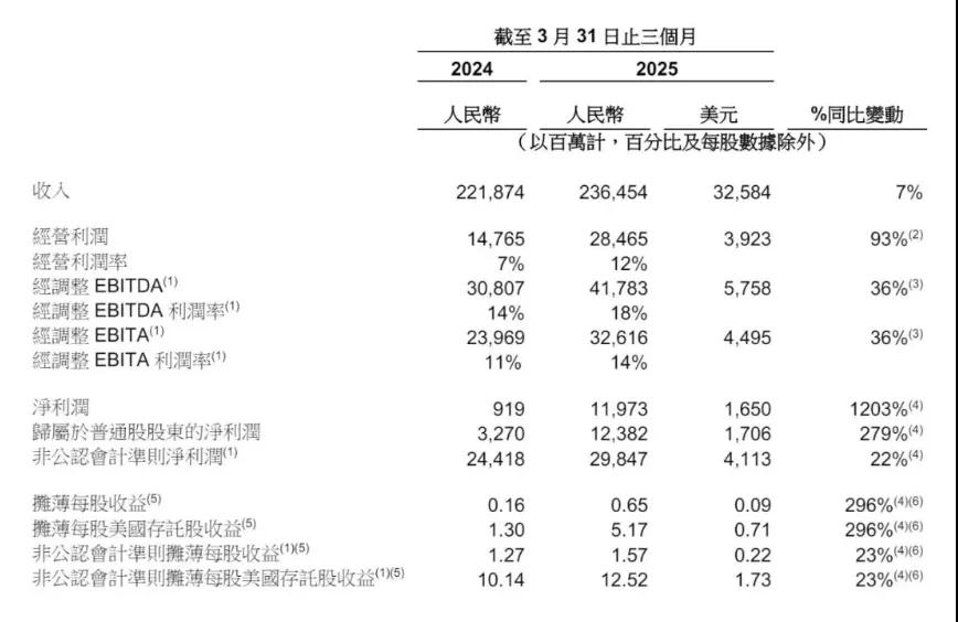 阿里巴巴第四财季(注:阿里巴巴财年与自然年不同步,2024年4月1日至2025年3月31日为2025财年),营收为2364.54亿元,同比增长7%。不按美国通用会计准则(non-GAAP),净利润为298.47亿元(约合41.13亿美元)。