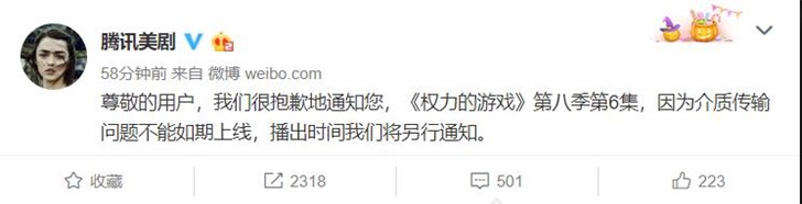 腾讯:《权力的游戏》第八季第6集无法如期上线快报