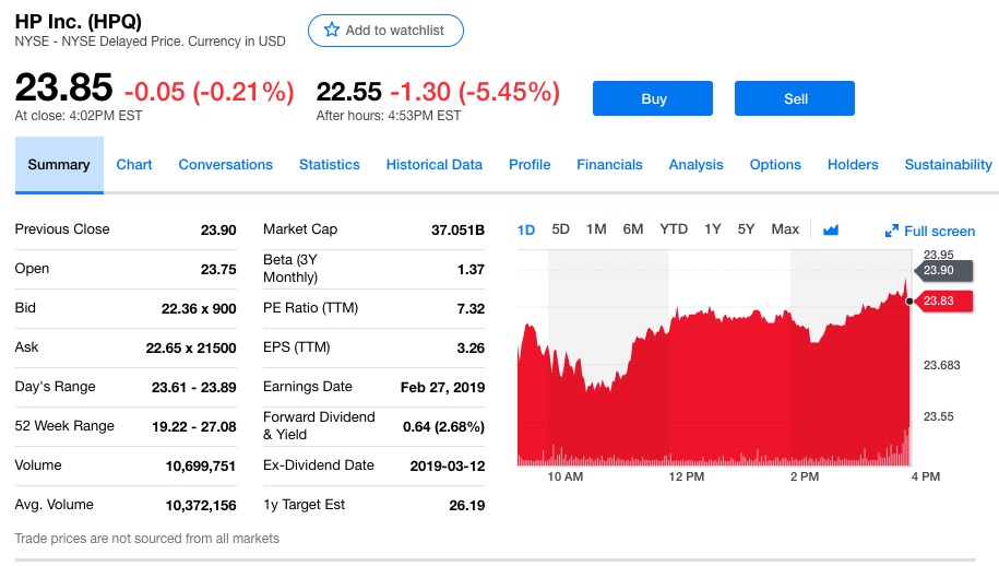 惠普预计每股摊薄净收益介于2.00美元至2.10美元之间,2019财年第二季度每股摊薄净收益介于0.45美元至0.48美元之间,惠普股价下跌0.05美元。