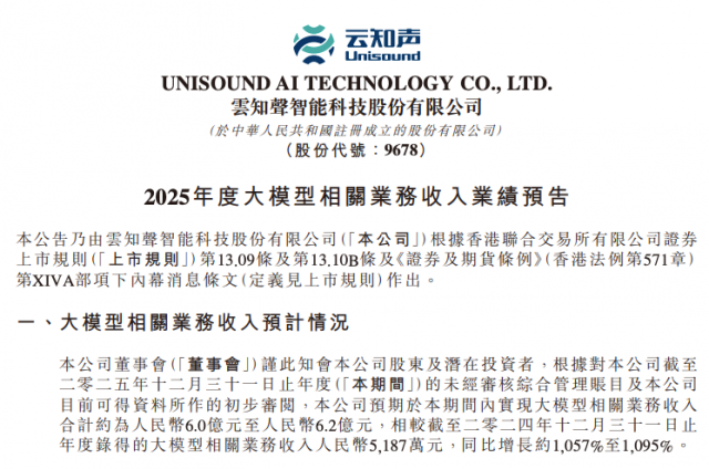 公告显示,根据初步测算,云知声预计在2025年度实现大模型相关业务收入约人民币6.0亿元至6.2亿元,较2024年同期的约5187万元大幅增长约1057%至1095%。