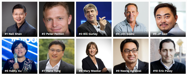 排在第二位和第三位的均来自投行Benchmark,分别为彼得·芬顿(Peter Fenton)和比尔·格利(Bill Gurley)。第四和第五位排名依次为红杉资本的吉姆·戈兹(Jim Goetz)和启明创投的甘剑平。