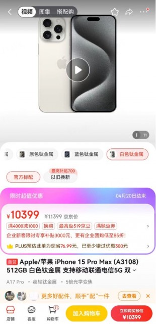 【TechWeb】4月15日消息,近日,有网友晒出自己在京东购买的iPhone 15 Pro Max 512G版,到手价10399元,相比官网原价便宜超1000元,价格再次大跳水。