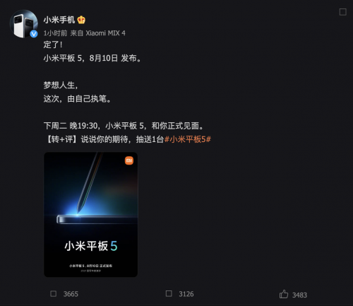 【TechWeb】就在今天上午,万众期待的小米平板终于官宣!小米手机官方微博与8月6日上午正式确认,时隔三年首次更新的小米平板产品线,将在8月10日的小米新品发布会上带来新品-小米平板5,并配文称,梦想人生,这次,由自己执笔。