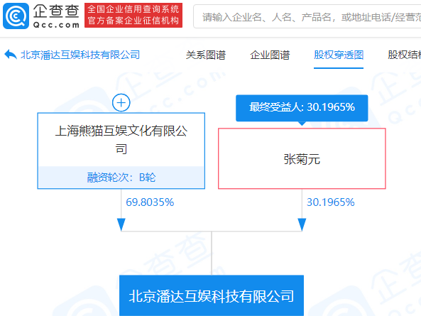 北京潘达互娱科技有限公司发生工商变更,由熊猫直播运营主体上海熊猫互娱文化有限公司和熊猫直播COO张菊元共同持股,企查查信息显示。