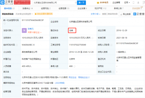 【TechWeb】企查查APP显示,8月18日,北京潘达互娱科技有限公司发生工商变更,企业状态由存续变更为注销。