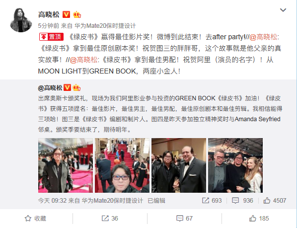 由阿里影业联合出品的《绿皮书》,联合出品方阿里影业成为继亚马逊、Netflix后全球第三家联合出品获奥斯卡最佳影片提名的互联网公司,阿里影业自成立之初即确立国际化发展战略。