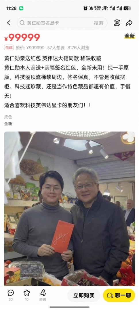 但令人没想到的是,这一事件如今有了令人哭笑不得的后续,在二手平台有卖家开始出售声称是黄仁勋签名的红包,标价高达999999元人民币。
