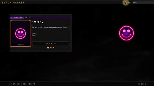 之前《使命召唤15》就因为在游戏中售卖红点准星,而备受玩家吐槽。虽然骂名不断,但这类微交易内容的销量看起来应该是还不错,官方近日又推出了一款“笑脸”准心,售价200游戏内点数,换算过来是1.79英镑(约合人民币15.7元)。