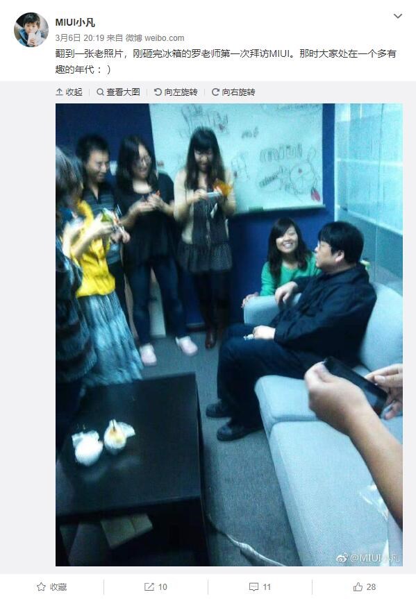 他表示这是当年罗永浩刚砸完冰箱第一次拜访小米MIUI时拍下的照片,上述即是罗永浩当年砸冰箱的故事,在砸冰箱事件一年后的小米2012新品(小米手机2)发布会上。