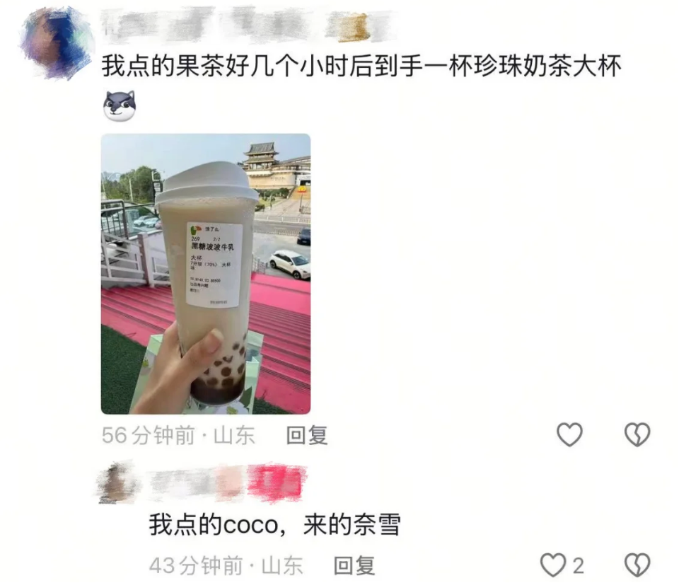 还有网友称,收到了货不对板的奶茶,“我点的果茶好几个小时后到手一杯珍珠奶茶大杯”“我点的coco,来的奈雪。”有的用户因为等不及,甚至主动跟外卖小哥说,随便拿一杯送。有的则干脆取消订单。