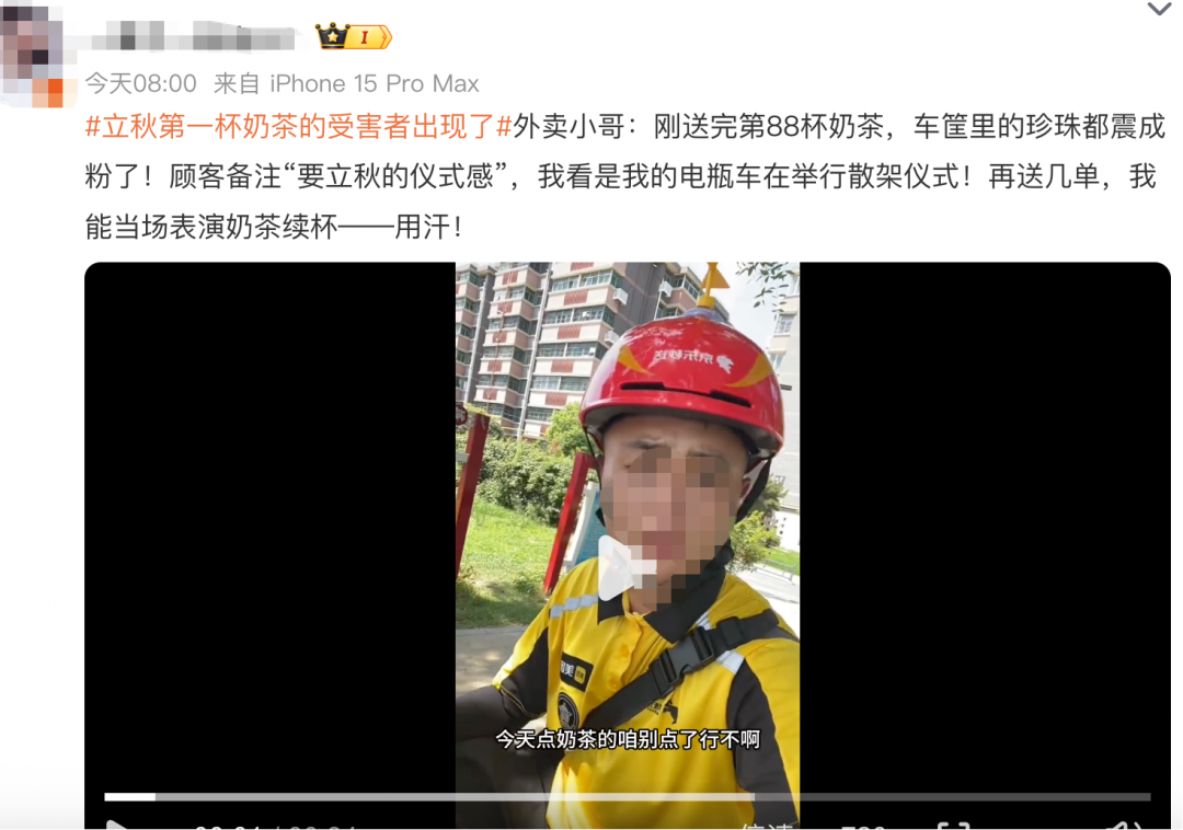 值得一提的是,立秋当天,天气并不算凉爽,全国多地最高气温仍在30度以上。有骑手调侃称,“刚送完第88杯奶茶,车筐里的珍珠都震成粉了!顾客备注‘要立秋的仪式感’,我看是我的电瓶车在举行散架仪式!再送几单,我能当场表演奶茶续杯——用汗!”