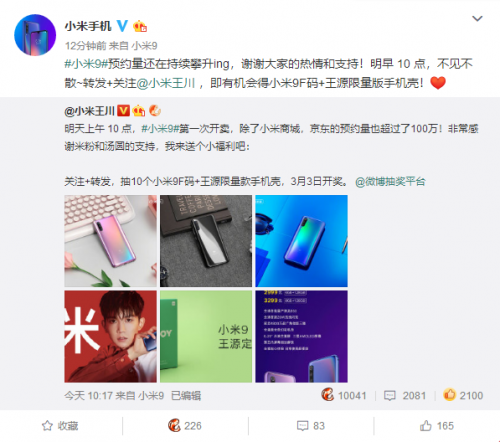 【TechWeb】2月20日,小米在北京正式推出了新一代旗舰小米9,该机全球首发骁龙855处理器,后置4800万像素三摄,支持20W无线闪充,现已在多平台开启预约。现在有最新消息,小米联合创始人、小米集团中国区总裁王川今日预告,该机将于明日上午10点正式发售,售价2999元起。