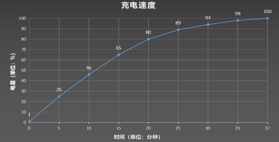 而在实际充电测试中,该机10分钟便可充入46%,30分钟可充满94%,完全充满也仅需37分钟,这一充电速度与官方宣称的基本一致,可以让你在任何短暂的空余时间轻松将电池充满,解决大部分场景的充电需求,大大缓解电量焦虑。