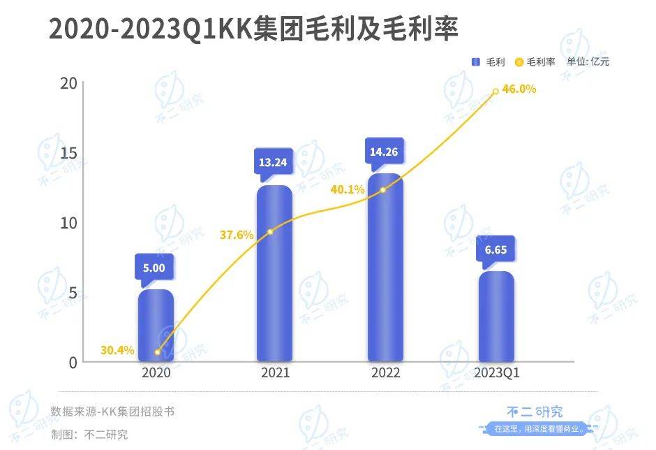 从毛利来看也是如此。2020-2022年及2023年一季度,KK的毛利分别为5.00亿元、13.24亿元、14.26亿元及6.65亿元,其中2020-2021年呈现翻倍式上涨,同比增长164.8%,但2022年增速断崖式下跌,仅有7.70%。