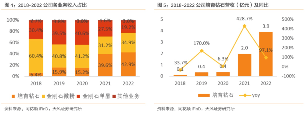 拆分来看,培育钻石是拉动力量钻石业绩增长的主力,2021年和2022年分别同比增长428.7%、97.1%,占总营收四成左右。