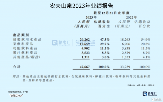 2023年,农夫山泉总收入426.67亿元,同比增加28.4%,2023年归母净利润120.79亿元,同比增加42.2%,双双创下新高。