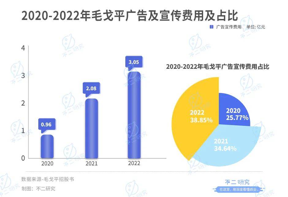 根据新版招股书,2020年-2022年,毛戈平广告费及业务宣传费的金额分别为9564.47万元、2.08亿元和3.05亿元,三年半共花掉6亿元。