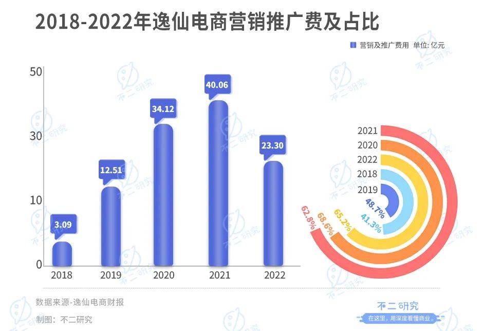 财报显示,过去5年,逸仙电商花在营销推广上的费用居高不下。2018年-2022年,逸仙电商的营销费用分别为3.09亿元、12.51亿元、34.12亿元、40.06亿元和23.3亿元,占同期营收的比重分别为48.7%、41.3%、65.2%、68.6%和62.8%。