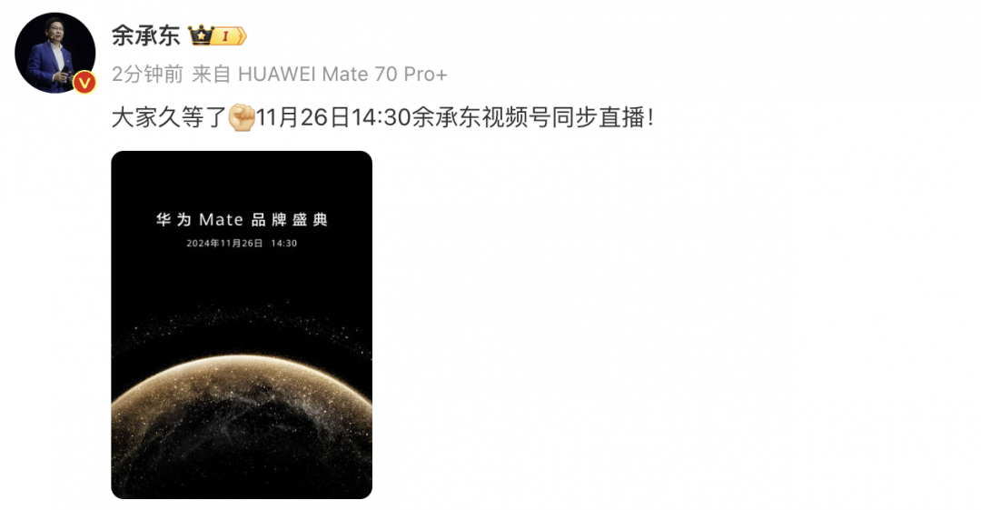 余承东官宣Mate70系列定档11月26日