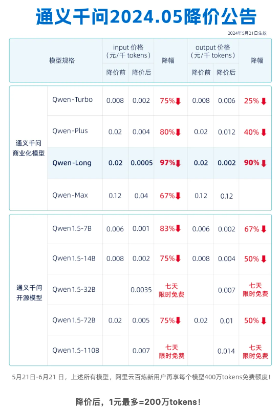 通义千问GPT-4级主力模型降价97%,1块钱200万tokens快讯