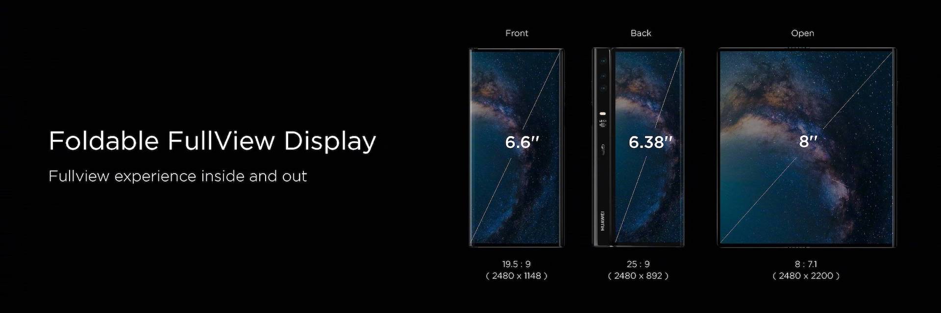 Mate X正面屏幕6.6英寸,19.5:9比例2480x1148分辨率;背面屏幕6.38英寸,25:9比例2480x892分辨率。展开后是一块8英寸大屏,8:7.1比例2480x2200分辨率。
