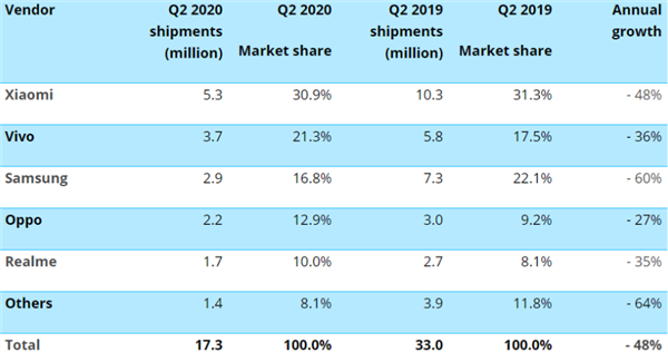 数据显示,2020年第二季度,印度智能手机市场总计出货了1730万部手机。尽管和去年同期相比下滑了48%,但小米仍然以530万部的出货量继续领跑,市场份额达31.1%。