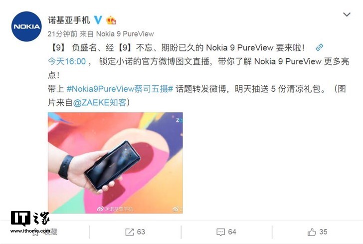 诺基亚手机官微刚刚宣布,将于今天下午16:00,图文直播诺基亚9 PureView国行版发布会。