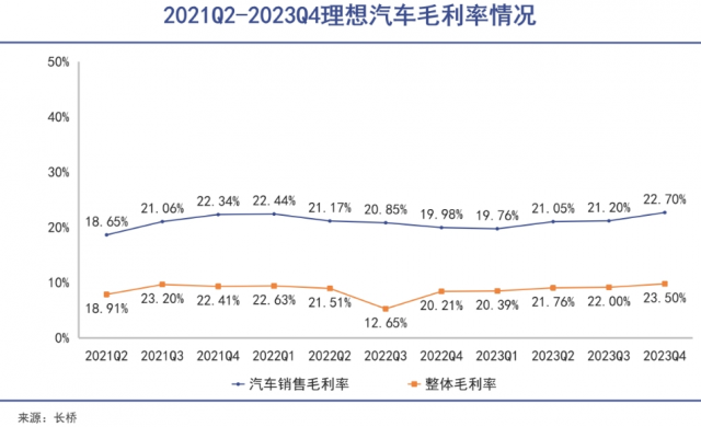 车辆销售毛利率是观察新能源车企的“灵魂指标”,2023年四季度,理想卖车业务毛利率上升到22.7%,全年车辆毛利率达到21.5%的历史高位。