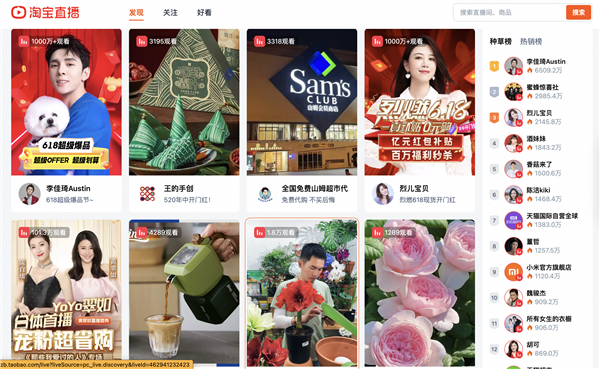 据了解,此番改版后,淘宝APP上所有的直播间都已在网页版上线。直播间列表清晰排列,右侧还能看到相关排行榜。