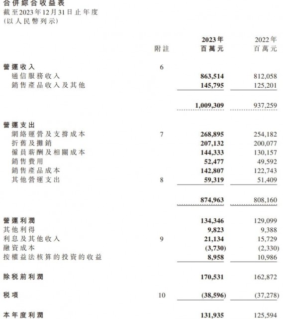 中国移动2023年营收1.01万亿元同比增长 7.7%,净利润1318亿元快讯