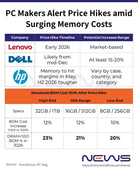 IT之家 12 月 27 日消息,韩媒 Chosun Biz 昨日(12 月 26 日)发布博文,报道称受历史性内存短缺影响,联想和惠普等主要笔记本电脑制造商或将推迟 2026 年的新品发布计划。