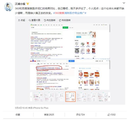 自五一起,魏则西事件让互联网医疗推广几乎遭遇灭顶之灾,在舆论及相关监管部门的关注与严查下,涉事搜索引擎百度数百亿市值灰飞烟灭受关注。而5月3日中国第二大搜索引擎360搜索的一纸宣布下线所有医疗商业推广的公开信,更被网友称为“神补刀”。