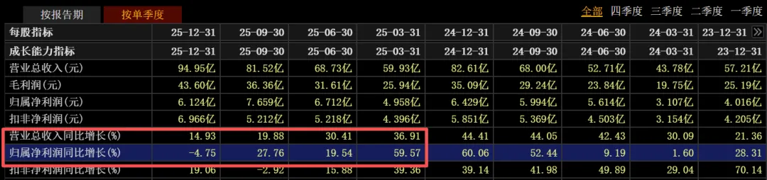 个中原因就藏在季度趋势的变化上,2025年一至四季度单季,公司营收增速分别为36.91%、30.41%、19.88%和14.93%,持续走低;净利润季度增速趋势也类似甚至恶化趋势更明显,各季分别为59.57%、19.54%、27.76%和-4.75%。四季度的净利润,甚至出现了负增长。