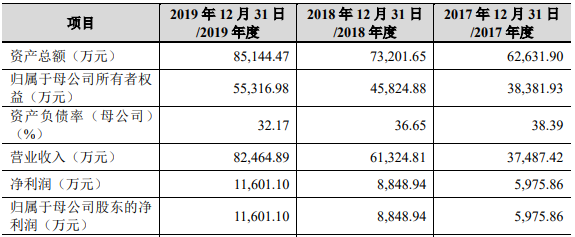 申报稿财务数据显示,2017年至2019年,公司实现营收分别为3.75亿元、6.13亿元、8.25亿元;实现归母净利润分别为5,975.86万元、8,848.94万元、1.16亿元。